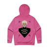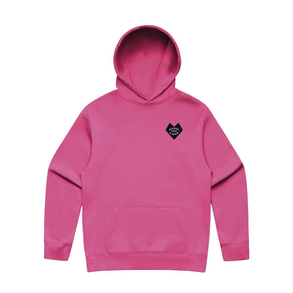 Hot Pink mid-weight, 80% cotton 20% recycled polyester CVC fleece cotton, relaxed unisex fit. Small black heart logo on front, large screen-print design back.