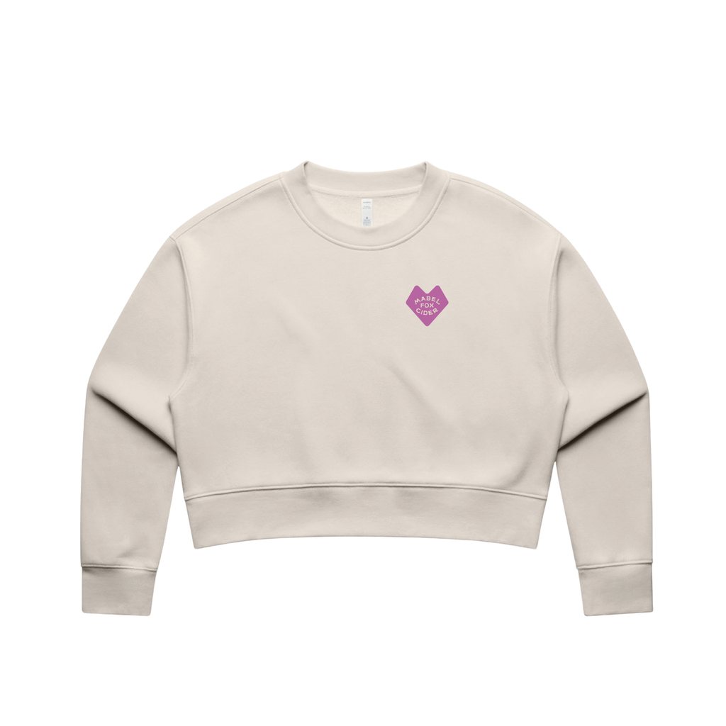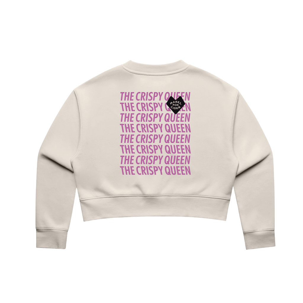 Light grey cropped sweatshirt with screen-printed logo front and large design on the back.
